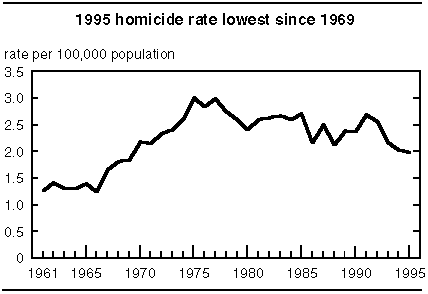 The 1995 rate of 1.98 homicides per 100,000 people was 3% lower than in 1994, well below the 1975 peak of 3.02. The homicide rate more than doubled between 1961 and 1975. Since then, despite annual fluctuations, the rate has been gradually decreasing.